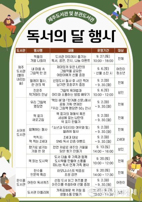 한국시사경제 한장선 객원기자 | 제주도교육청 제주도서관은 9월 ‘독서의 달’을 맞아 본관 및 분관 도서관에서 지역 주민과 함께하는 다양한 독서·문화 프로그램을 운영한다.