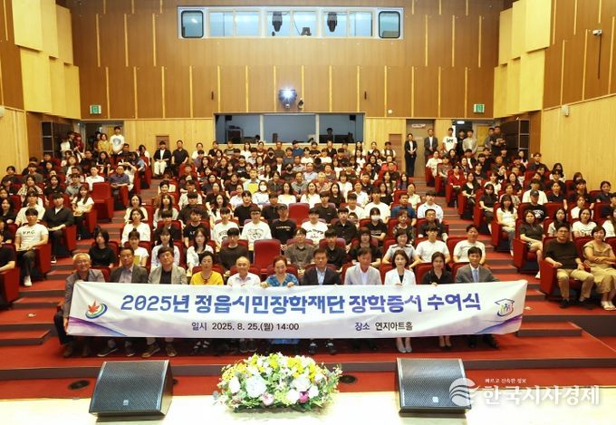 한국시사경제 전북취재본부 | 정읍시민장학재단이 지난 25일 연지아트홀에서 ‘2025년 정읍시민장학재단 장학생 장학증서 수여식’을 열고 장학생 190명에게 총 4억 원을 전달했다.