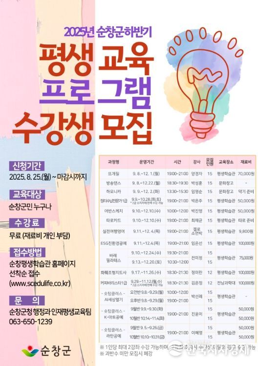 한국시사경제 전북취재본부 | 순창군이 오는 9월 5일까지‘2025년 하반기 평생교육 프로그램’수강생을 선착순 모집한다.
