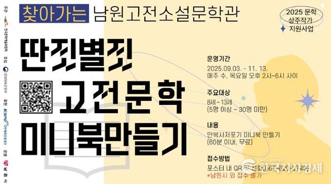 최경식 남원시장은 “이번 프로그램을 통해 시민들이 문학을 단순히 읽는 것을 넘어, 직접 만들고 나누는 체험적 활동으로 접하며 문학적 소양을 함양할 수 있기를 바란다”며, “문학이 주는 즐거움과 가치를 스스로 발견하는 소중한 계기가 될 것”이라고 밝혔다.