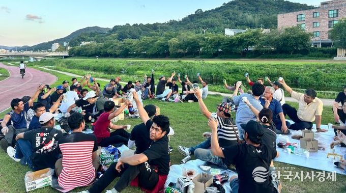 한국시사경제 전북취재본부 | 정읍시와 샘골농협이 지난 25일 정읍천변에서 공공형 외국인 계절근로자를 위한 치맥파티를 열고 폭염 속 현장을 지킨 근로자들의 사기 진작에 나섰다.