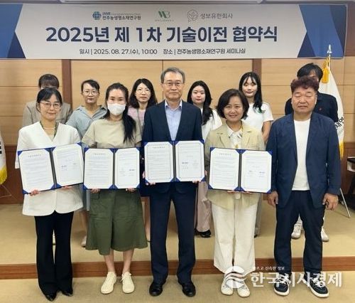 (재)전주농생명소재연구원(이하 연구원)은 27일 성보유한회사(대표이사 엄미섭), 농업회사법인 웰앤뷰(주)(대표이사 주민선)와 기술 이전 협약을 체결했다.