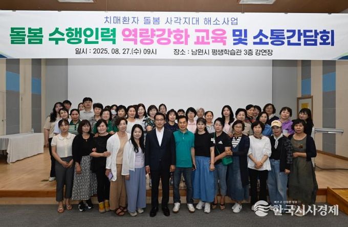 한국시사경제 전북취재본부 | 남원시는 8월 27일 오전 11시, 평생학습관 3층 강연장에서 치매 돌봄 수행인력, 생활지원사, 요양보호사 등 62명이 참석한 가운데 '춘향愛 톡! 톡! 지역 유관단체 간담회'를 개최했다.