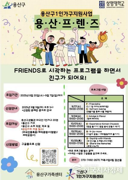 한국시사경제 한장선 객원기자 | 서울 용산구가 내달 중 지역 내 거주하는 외국인 1인가구의 안정적인 정착과 사회적 고립 예방을 위한 ‘용산 프렌즈(Friends)’ 프로그램을 운영한다. 참가자 정원은 20명이며 내달 7일까지 모집한다.