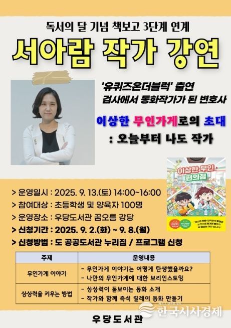 한국시사경제 한장선 객원기자 | 제주시 우당도서관은 ‘책보고 어린이 독서습관 기르기 사업’의 일환으로 오는 9월 13일 오후 2시 꿈오름 강당에서 서아람 동화 작가 초청 강연을 개최한다.