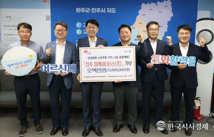 전주시와 NH전북농협 지역사회공헌단(단장 박병철, 전북농협 노조위원장), NH농협 전주시지부(지부장 하양진)는 29일 전주시장실에서 우범기 전주시장과 박병철 전북농협 노조위원장, 하양진 지부장 등이 참석한 가운데 전주지역 독거노인 지원을 위한 나눔 프로젝트인 ‘전주함께미(米)소(笑)’ 기부금 전달식을 가졌다.
