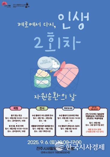 한국시사경제 전북취재본부 | 전주시는 오는 6일 전주시새활용센터 다시봄에서 ‘자원순환의 날’을 기념하는 ‘제로에서 다시, 인생 2회차’ 행사를 개최한다.