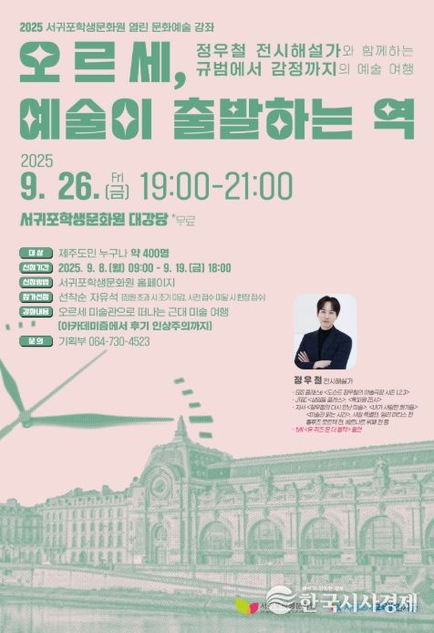 한국시사경제 한장선 객원기자 | 제주도교육청 서귀포학생문화원은 서귀포시교육발전기금과 협력해 오는 26일 오후 7시 서귀포학생문화원 대강당에서 도민 400명이 함께하는 ‘2025 열린 문화예술 강좌’를 개최한다.