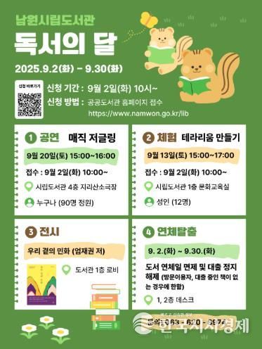 한국시사경제 전북취재본부 | 남원시공공도서관(어울림·시립·어린이청소년)은 9월 ‘독서의 달’을 맞아 시민들이 책 읽는 즐거움과 다양한 문화생활을 누릴 수 있도록 공연, 전시, 체험 프로그램을 운영한다.
