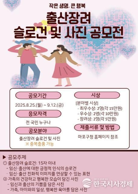 한국시사경제 한장선 객원기자 | 마포구는 임신과 출산에 대한 사회적 관심을 높이고 출산 친화 분위기를 형성하고자 9월 12일까지 ‘출산장려 슬로건 및 사진 공모전’을 개최한다.