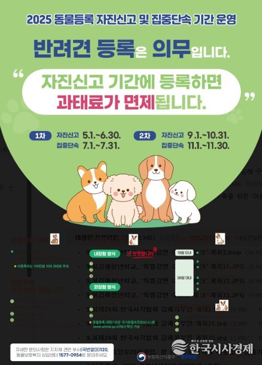 시 관계자는 “반려견 동물등록은 성숙한 반려문화 정착을 위한 첫걸음이다”며 “자진신고 기간 내에 반려인의 적극적인 참여를 바란다”고 말했다.