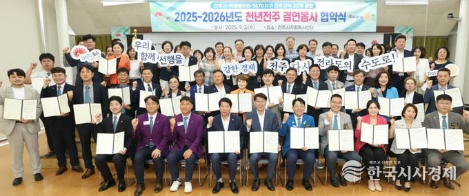 시와 국제로타리 3670지구는 3일 전주시자원봉사센터에서 우범기 전주시장과 남관우 전주시의회 의장, 김성희 국제로타리 3670지구 총재, 박신규 로타리 재전협의회 의장, 전주지역 30개 로타리클럽 관계자, 동 주민센터 관계자 등 80여 명이 참석한 가운데 ‘2025-2026년도 천년전주 결연봉사 협약식’을 가졌다.