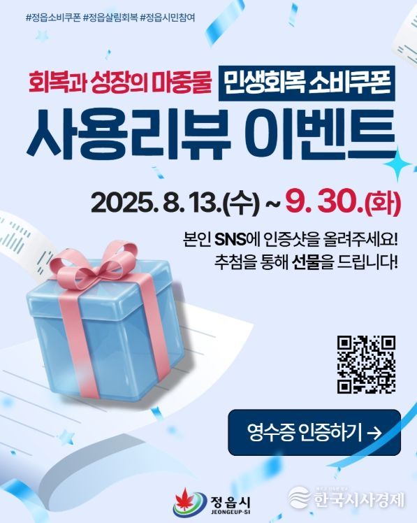 이번 이벤트는 시민이면 누구나 참여할 수 있다. 소비쿠폰 사용 가능 매장에서 결제 후 인증샷을 촬영해 개인 SNS(블로그, 인스타그램, 페이스북, 카카오스토리, 카카오톡 채널 등)에 #정읍소비쿠폰 해시태그와 함께 사용 후기를 게시하면 된다. 이후 네이버폼에 게시물 링크와 참여 정보를 입력하면 응모가 완료된다.