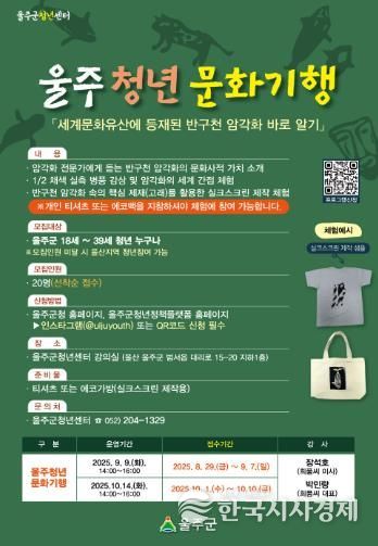 울주군 관계자는 “이번 문화기행은 청년들이 지역의 소중한 문화유산을 직접 체험하며 창의성과 감수성을 발휘하는 기회가 될 것”이라며 “지역 정체성과 문화적 자긍심을 높이는 데도 큰 의미가 있다”고 말했다.