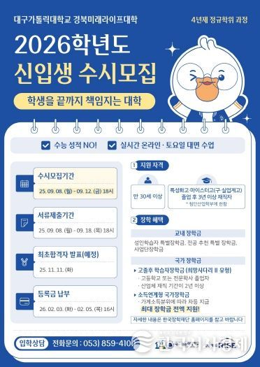 한국시사경제 한장선 객원기자 | 대구가톨릭대학교 경북미래라이프대학은 고령캠퍼스 운영을 위하여 고령군민 성인학습자를 대상으로 2026학년도 신입생 수시모집을 실시한다. 고령군은 평생학습 환경 조성을 위해 2024년 12월 대구가톨릭대학과 고령캠퍼스 설립 업무 협약을 체결했으며, 이번 모집은 RISE(지역혁신중심 대학지원체계) 사업의 일환으로 성인들에게 배움의 기회를 제공하여 지역사회 및 산업현장 수요에 맞는 전문 인재를 양성하기 위한 것이다.