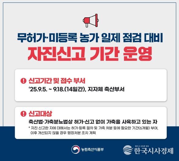 점검에 앞서 고령군은 지난 5일부터 18일까지 14일간 자진신고 기간을 운영한다고 밝혔다. 대상은 허가·신고없이 가축을 사육중인 농가이며 자진신고 농가는 허가·등록 절차와 가축 처분등에 필요한 6개월 시정 기간을 부여받지만, 자진신고 기간 이후 가축사육 적발 시 과태료 등