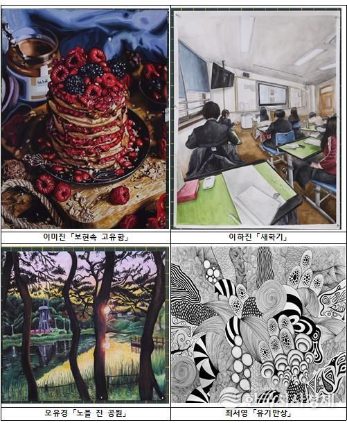주요 전시작품은 ▲ 오유경 학생의‘노을 진 공원’, ▲ 이미진 학생의‘보현속 고유함’, ▲ 최서영 학생의‘유기만상’, ▲ 이하진 학생의‘새학기’ 등이다.