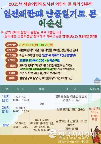 한국시사경제 김숙영 기자 | 해운대구는 ‘여행하는 어린이 길 위의 인문학’프로그램 ‘임진왜란과 난중일기로 본 이순신’참가자를 모집한다.