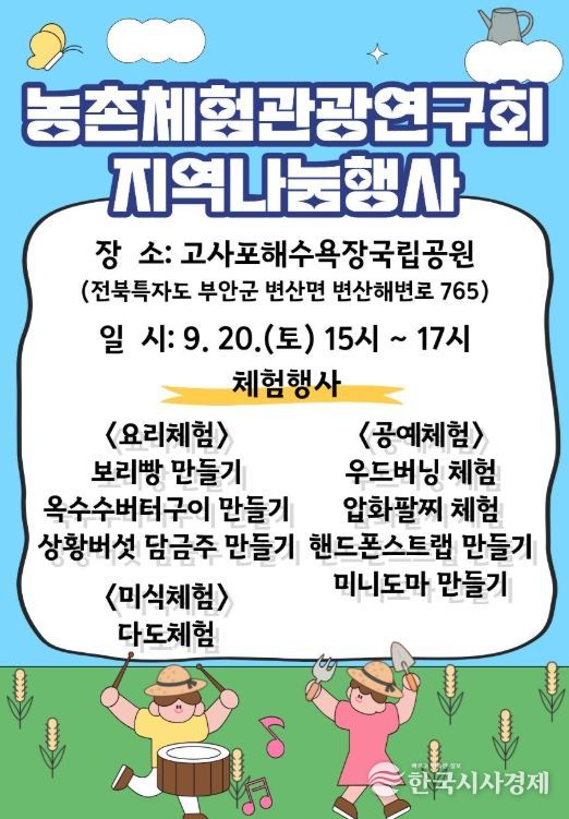한국시사경제 김숙영 기자 | 부안군 농촌체험관광연구회(회장 채명심)가 오는 20일 변산면 고사포해수욕장에서 ‘무료 체험 프로그램’를 개최한다.