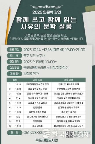 한국시사경제 전남취재본부 | 목포시립도서관은 오는 10월 14일부터 매주 화요일 오후 7시, 인문학 글쓰기 강연 '함께 쓰고 함께 읽는, 사유의 문학 살롱'을 운영한다.