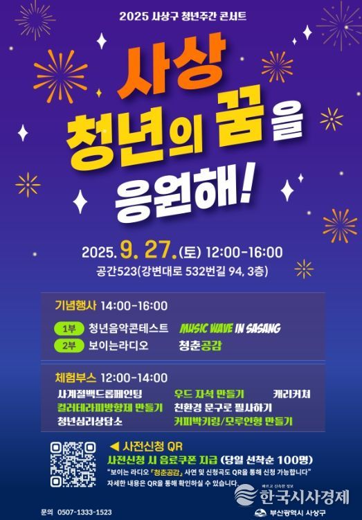 한국시사경제 김숙영 기자 | 부산 사상구는 청년 주간을 맞아 오는 9월 27일 12시부터 엄궁동 공간523에서 사상구 청년 콘서트를 개최한다.