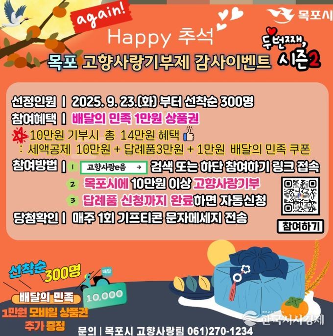 한국시사경제 전남취재본부 | 목포시는 지난 16일부터 진행한 추석 명절맞이 고향사랑기부제 참여 이벤트가 기부자들의 뜨거운 성원에 힘입어 단 3일 만에 조기 종료됨에 따라, 후속 행사인 ‘Happy 추석~ 목포 고향사랑기부제 감사이벤트 시즌2’를 추진한다고 밝혔다.