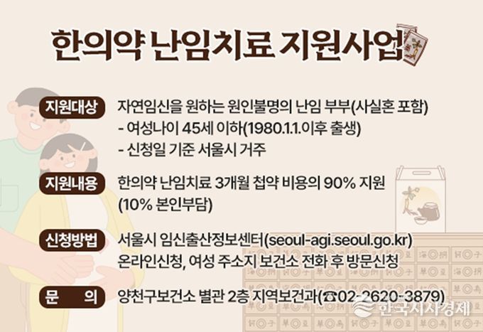 한국시사경제 윤경수 기자 | 양천구는 원인이 불명확한 난임으로 어려움을 겪고 있는 부부에게 한의약 난임 치료비를 지원한다고 28일 밝혔다.