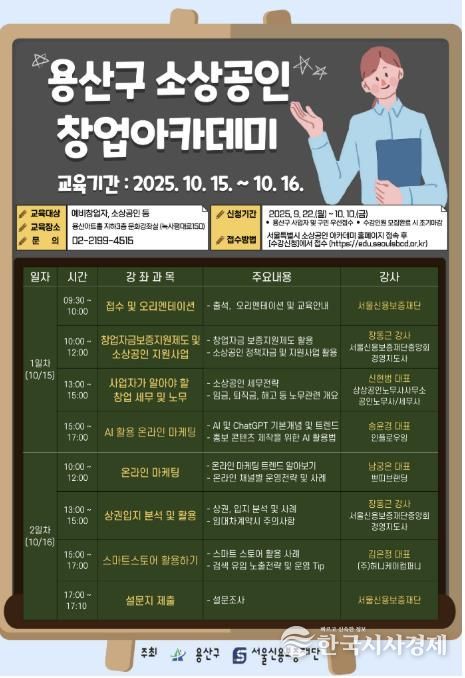 한국시사경제 한장선 객원기자 | 서울 용산구가 서울신용보증재단과 함께 예비창업자와 소상공인의 성공적인 창업 지원을 위한 ‘2025 하반기 창업아카데미’를 개최한다.
