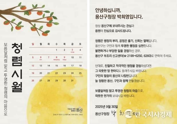 한국시사경제 한장선 객원기자 | 서울 용산구는 추석 명절을 맞아 구민과 민원인에게 청렴·반부패 실천 의지를 담은 ‘청렴 서한문’을 발송했다고 밝혔다.