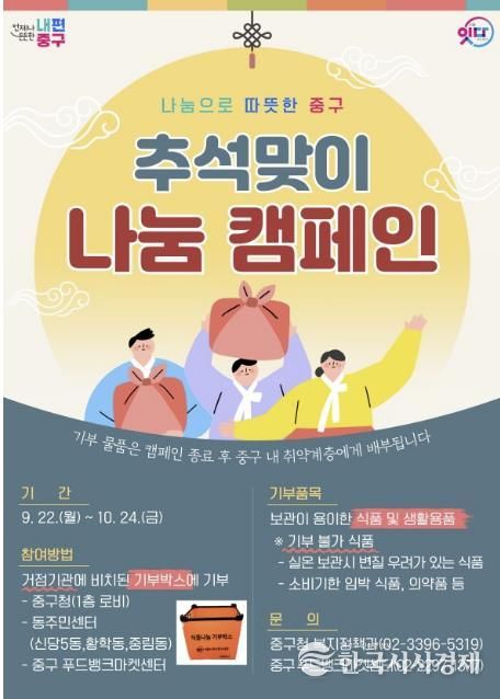한국시사경제 한장선 객원기자 | 서울 중구가 다가오는 추석 명절을 앞두고 어려운 이웃을 돕기 위해 '2025 추석맞이 나눔 캠페인'을 진행한다. 이번 캠페인은 지난 22일부터 오는 10월 24일까지 4주간 이어지며, 주민들의 따뜻한 동참으로 풍성한 명절 나눔을 실천할 예정이다.