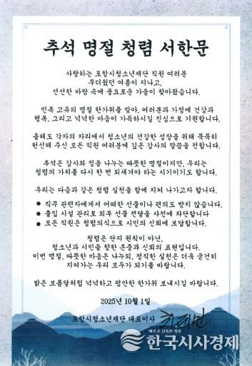 최제민 포항시청소년재단 대표이사는 서한문에서 “청렴은 단지 규범이 아니라 청소년과 시민에 대한 신뢰의 약속이자 존중의 표현”이라며, “이번 명절이 공직자의 청렴 의식을 되새기고, 투명한 행정을 실천하는 계기가 되길 바란다”고 전했다.