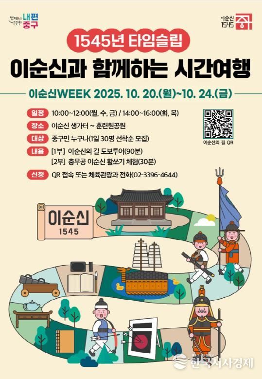 한국시사경제 노승선 기자 | 충무공 이순신의 고향, 서울 중구가 이순신 장군의 발자취를 따라 걷는 도보투어와 무예 정신을 되살리는 활쏘기 체험 프로그램을 오는 10월 20일부터 24일까지 운영한다.