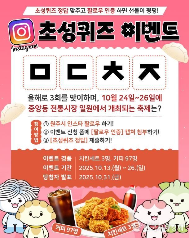 이번 초성퀴즈 제시어는 ‘ㅁㄷㅊㅈ’이며, 문제는 10월 24일부터 26일까지 3일간 원주 중앙동 전통시장 일원에서 열리는 축제의 이름이다.