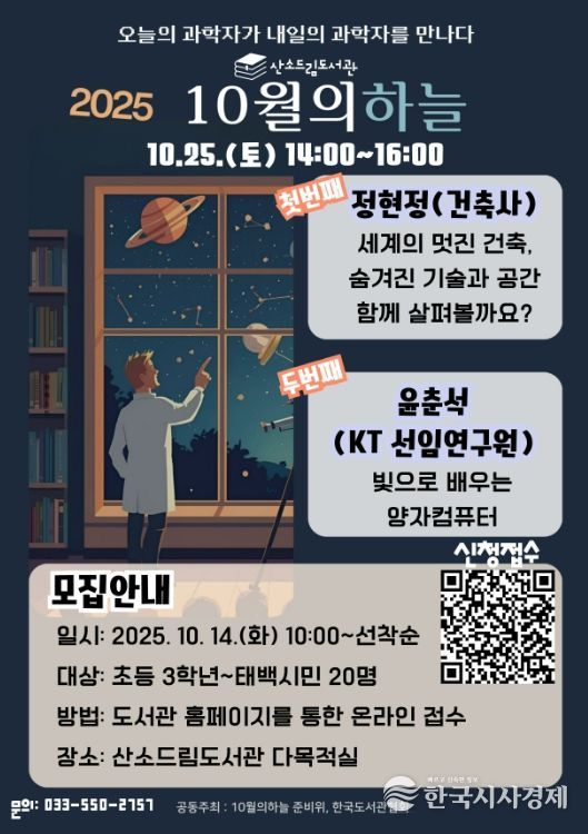 한국시사경제 권충언 기자 | 태백시는 산소드림도서관이 한국도서관협회와 ‘10월의 하늘’ 준비위원회가 공동 주최하는 재능기부 도서관 과학강연 '10월의 하늘' 공모사업에 선정됐다고 밝혔다.