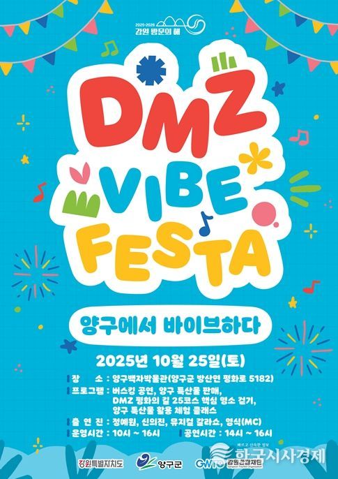 한국시사경제 권충언 기자 | 강원관광재단이 강원특별자치도, 양구군과 함께 오는 10월 25일 양구군 백자박물관 잔디마당에서 ‘디엠지 감성 축제(DMZ VIBE FESTA) 양구에서 바이브하다’를 개최한다고 밝혔다.