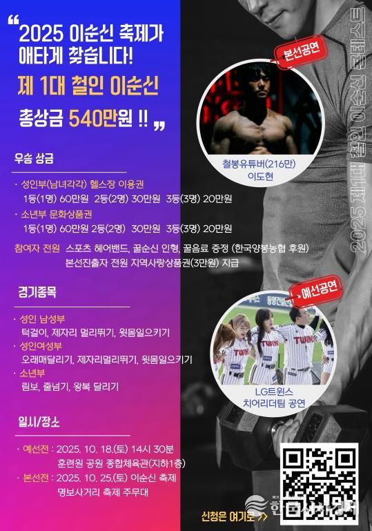 본선은 오는 25일 ‘2025 이순신 축제’에서 펼쳐진다. 본선은 한 종목으로 승부를 가른다. 성인 남성부는 턱걸이, 성인 여성부는 오래매달리기, 소년부는 줄넘기로 최종 우승자를 결정한다. 동별 단체전은 4명의 주민이 한 팀을 이뤄 총 1,545m를 로잉머신으로 가장 빠르게 완주하는 방식으로 진행된다. 이 거리는 이순신 장군의 탄생연도 ‘1545년’을 상징하며, 경기 모습은 LED 전광판을 통해 생중계된다. 여기에 구독자 216만명을 보유한 유명 철봉 유튜버 이도현 씨가 특별 공연을 펼치며 현장의 열기를 끌어올릴 예정이다.