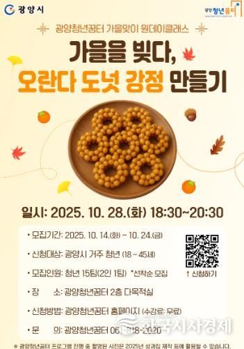 한국시사경제 권충언 기자 | 광양시는 청년들의 여가문화 활성화와 정서적 힐링을 위한 프로그램의 일환으로, 광양청년꿈터에서 가을맞이 원데이클래스 ‘가을을 빚다 – 오란다 도넛 강정 만들기’ 참가자를 모집한다고 14일 밝혔다.