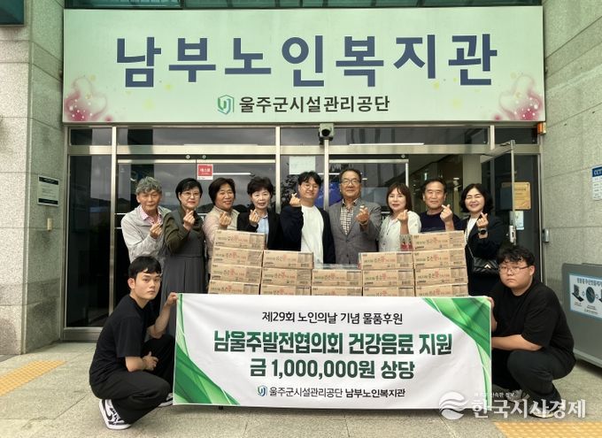 한국시사경제 울산취재본부 | 울주군시설관리공단 남부노인복지관(관장 조덕행)은 10월 14일 남울주발전협의회(회장 한성율)로부터 100만원 상당의 건강음료 1,000개를 기부받았다.