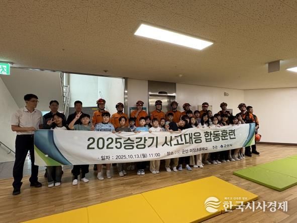 한국시사경제 전북취재본부 | 군산시는 한국승강기안전공단, 군산소방서, 관리업체가 함께 참여한 가운데 미장초등학교 학생들 30여 명을 대상으로‘2025년도 승강기 합동훈련’을 실시했다.