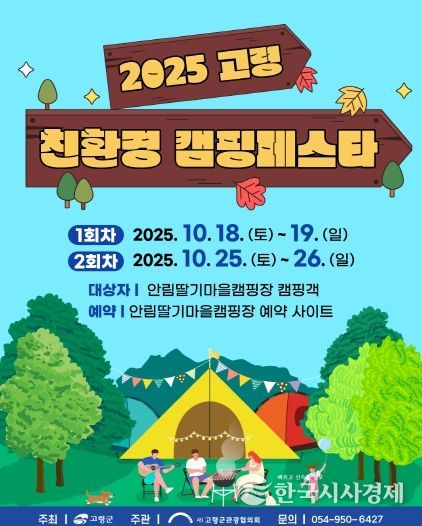 한국시사경제 권충언 기자 | 지역과 미래를 배려하는 친환경 캠핑 문화 확산을 위해 마련된 ‘2025 고령 캠핑 페스타’가 오는 10월 18일부터 19일, 10월 25일부터 26일 두 차례에 걸쳐 안림딸기마을캠핑장에서 열린다.