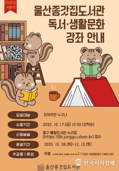 한국시사경제 울산취재본부 | 울산 중구에서 운영하는 울산종갓집도서관이 2025년 4분기 독서·생활문화강좌 수강생을 모집한다.