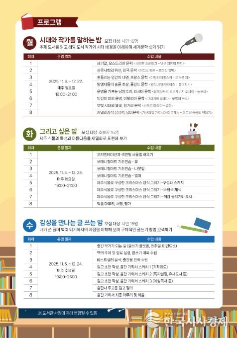 한국시사경제 노승선 기자 | 제주시 탐라도서관은 주간 시간대 도서관 이용이 어려운 주부와 직장인 등 시민들을 위해 다양한 야간 프로그램을 운영한다.