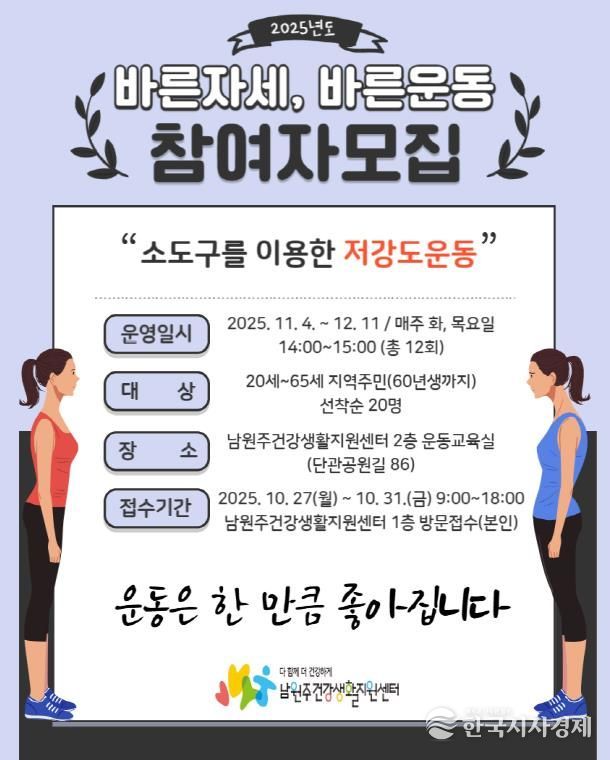 한국시사경제 권충언 기자 | 남원주건강생활지원센터는 다음 달 4일부터 지역 주민을 대상으로 건강생활실천 프로그램 ‘바른자세, 바른운동’을 운영한다.