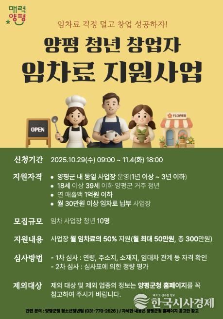 지원 대상은 △양평군에 주소를 둔 18세 이상 39세 이하 △공고일 기준 사업자등록증명 상 개업일 1년 이상 3년 이하 △연 매출액 1억 원 이하 △월 임차료 30만 원 이상 납부 중인 청년 창업자이다.