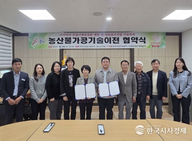 한국시사경제 문화팀 | 문경시농업기술센터는 10월 24일 농업기술센터 소회의실에서 “오미자, 배, 도라지추출물을 포함하는 호흡기 염증질환 예방 또는 치료용 조성물”(특허번호 제 : 10-2169920호) 특허기술을 관내업체인 “농업회사법인 행복팜(주)”에 이전하는 기술이전 협약식을 체결했다.