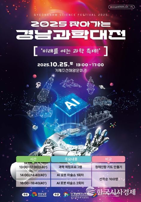 한편, 올해 18회째를 맞이하는 경남과학대전은 ‘상상력과 과학, AI와 로봇이 함께하는 2025 경남과학대전’이라는 슬로건으로 10월 31일(금)부터 11월 2일(일)까지 마산로봇랜드 앞 광장에서 개최된다. 연구기관, 학교, 기업 등 총 50개 기관이 참여해 △AI․로봇존 △융합과학존 △상상과학존 △사이언스 플레이존 △사이언스 스테이지존을 운영하며, 휴머노이드․4족보행 로봇과 과학공연․매직쇼․퍼레이드 등을 비롯해, 가족 관람객을 위한 놀이공간도 준비했다.