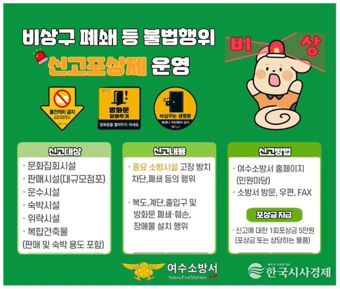 한국시사경제 오영주 기자 | 여수소방서(서장 서승호)는 소방시설 및 피난·방화시설의 불법행위를 시민이 직접 신고하면 포상금을 지급하는'소방시설 등 불법행위 신고포상제'를 적극 홍보 중이라고 30일 밝혔다.