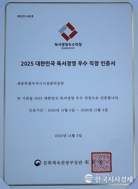 한국시사경제 세종취재분부 | 세종특별자치시시설관리공단은 문화체육관광부와 한국출판문화산업진흥원이 주최하고 한국능률협회컨설팅이 주관한『2025년 독서경영 우수직장 인증제』에서 우수직장 인증을 획득했다고 밝혔다.
