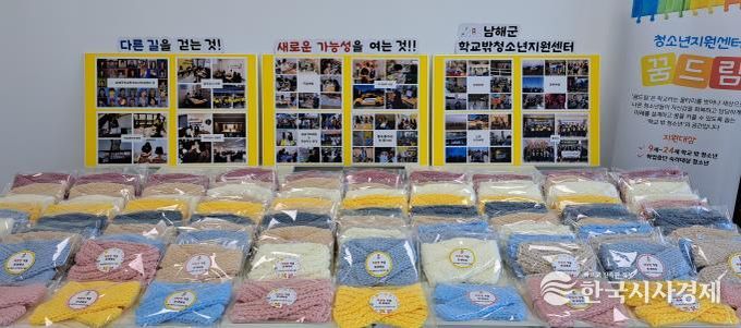 한국시사경제 경남취재본부 | 남해군 학교밖청소년지원센터 봉사동아리가 11일 지역 내 홀몸 어르신들을 위해 직접 제작한 목도리 100개를 기부했다.