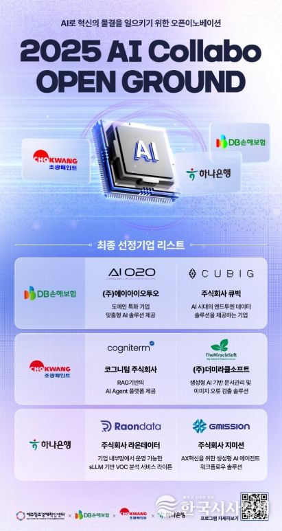 한국시사경제 경제팀 | 제주창조경제혁신센터(대표이사 이병선, 이하 제주센터)는 DB손해보험, 조광페인트, 하나은행과 함께 추진하는 특화산업 오픈이노베이션 ‘2025 AI 콜라보 오픈그라운드 프로그램’을 통해 최종 6개 스타트업을 선정하고, 기술 테스트와 솔루션 개발을 통해 실질적인 사업화 협력에 나선다.